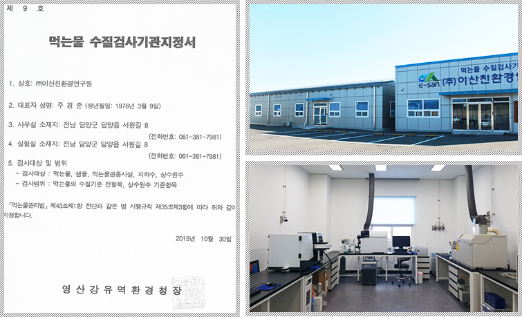 저희 (주)이산 친환경연구원은 공인인증 먹는물 수질검사기관으로 전라남도 담양군 담양읍 에코산단3로 30(삼만리 1295)에 위치하고 있으며 본 연구원은 첨단장비와 숙련된 기술인력을 통한 신속하고 정확한 분석 결과를 제공하고 있으며 수질관련 전문가들의 수질관련 컨설팅 및 각종 참고자료를 제공하여 드립니다.